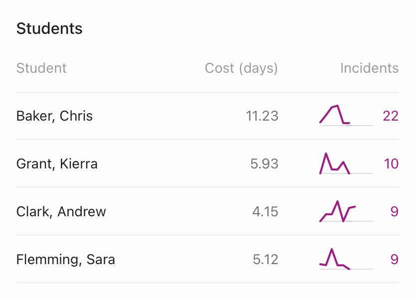 Incidents + helps you allocate your limited time, attention, and resources where they are needed most. State-of-the-art reports help you identify students in need of services, pinpoint when and where challenging behavior is most likely to occur, select and measure response to targeted interventions, and communicate more effectively with your students, parents, and faculty.